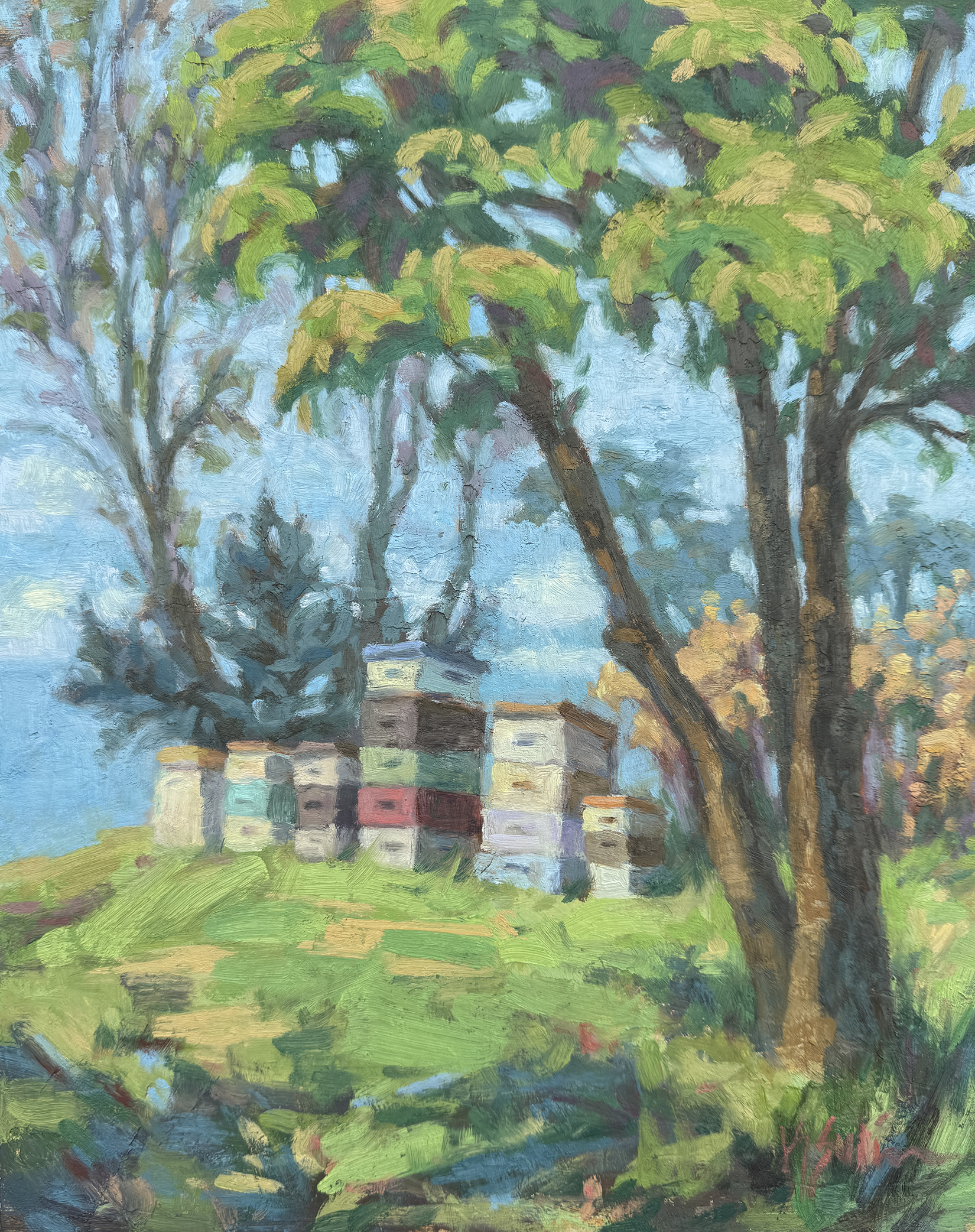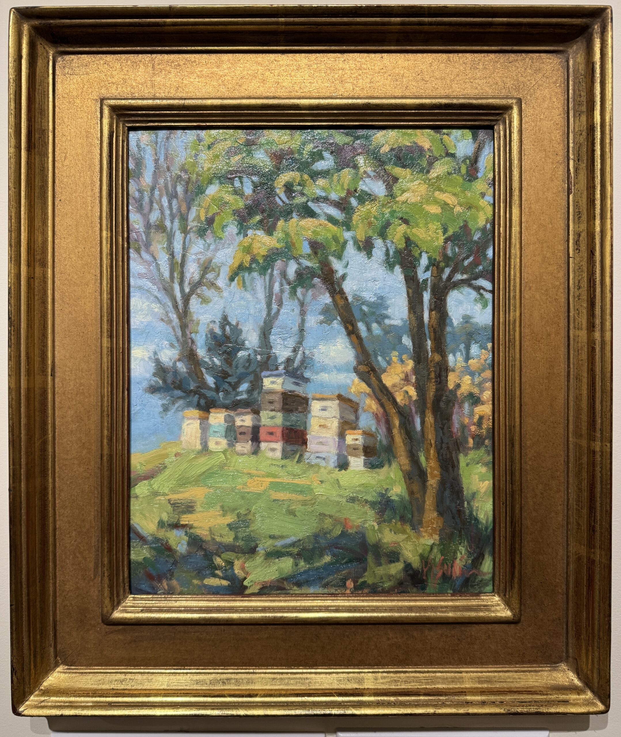 Bee Boxes on the Hillside is a 14″ x 11″ oil painting on plastered wood, framed in a custom wood frame with Gold Leaf by Masterworks Frames. A bucolic scene from the backroads of Hunterdon County, NJ.