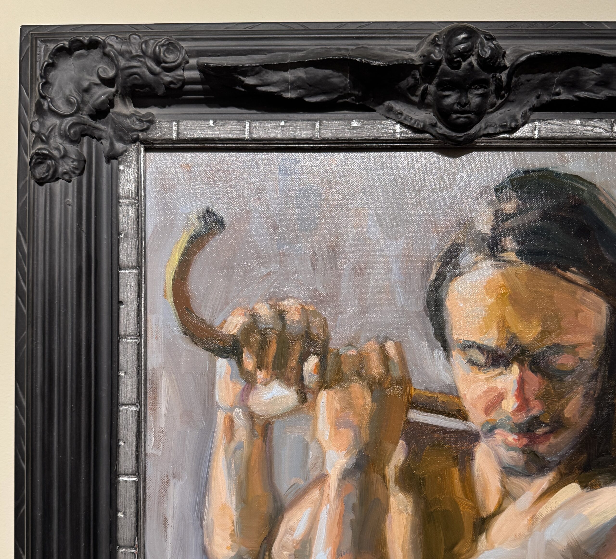 Giuseppe, painted in oil on fine linen canvas is 24″ x 14″ and framed in a mat black custom wood frame. Giuseppe is also available unframed for $1,950.
